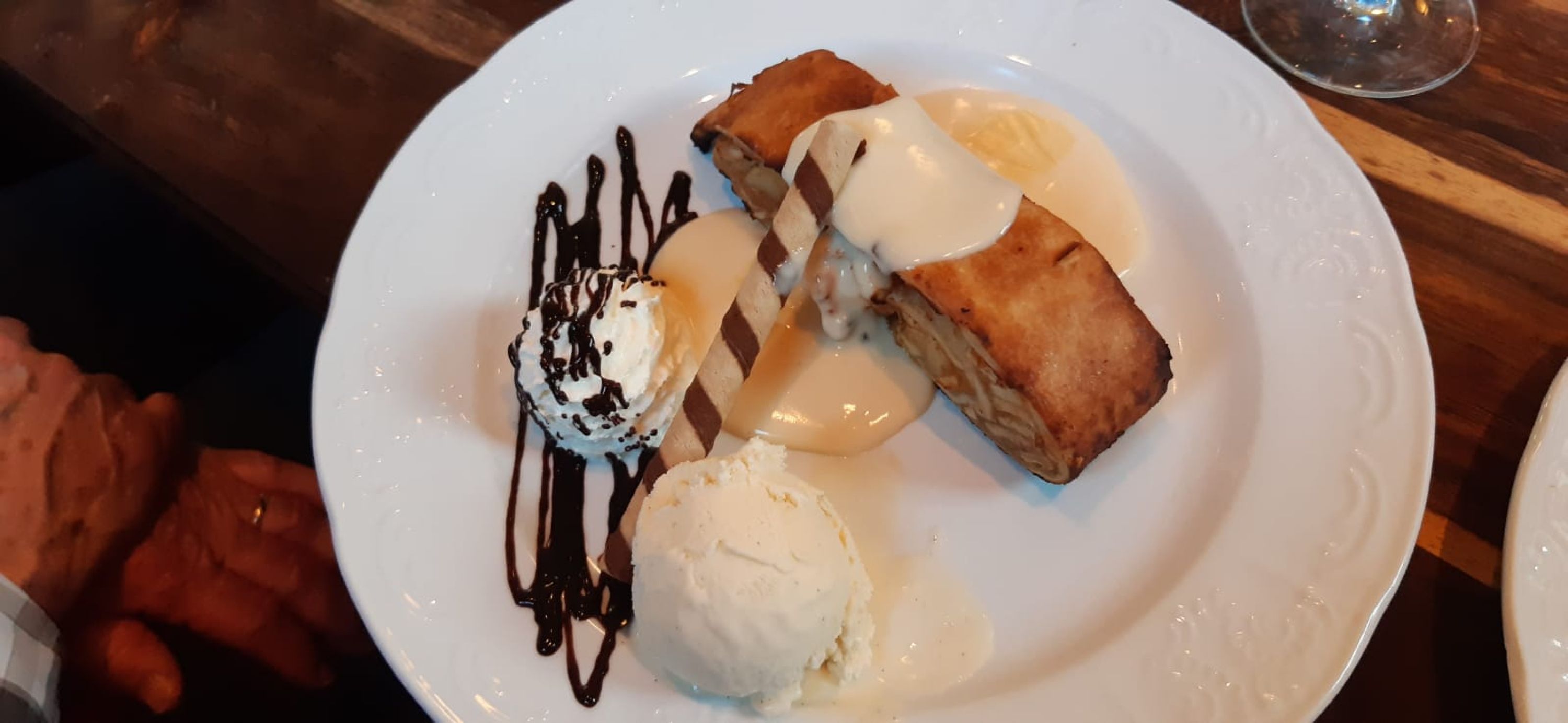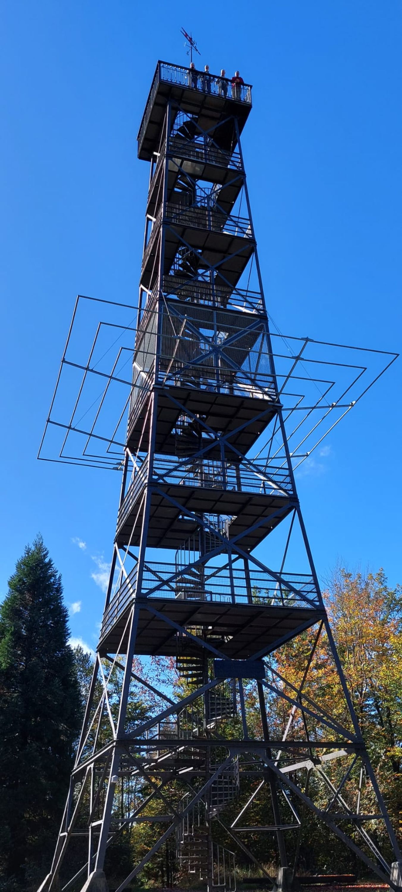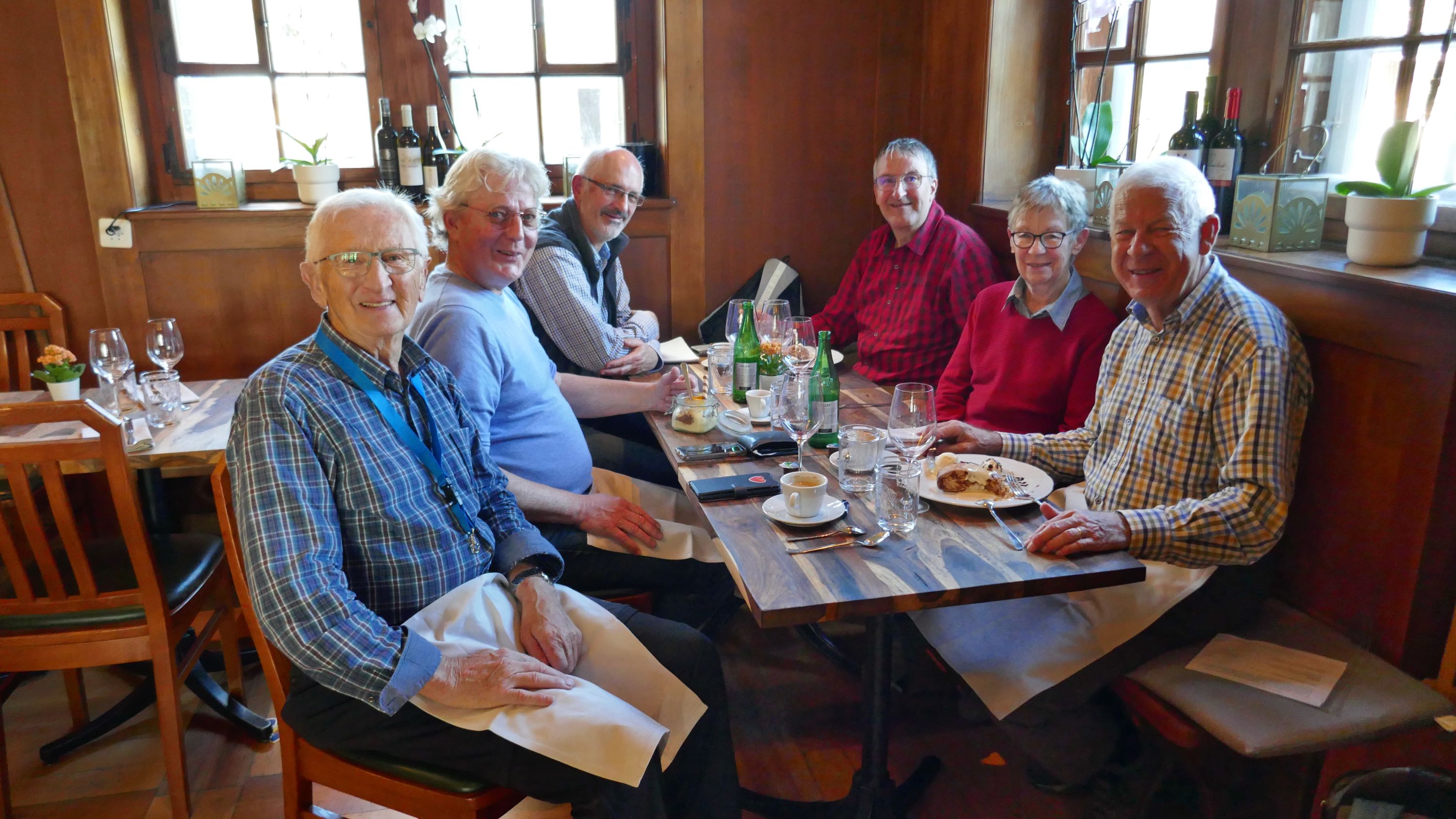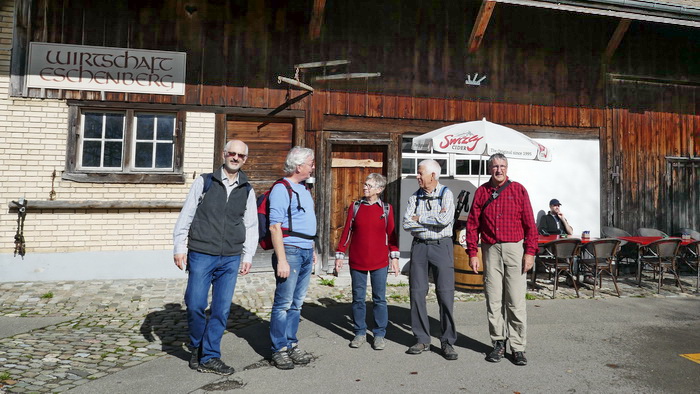 Nach dieser Stärkung richteten wir unsere Schritte, vorbei an einem Dammhirsch und einer Gruppe mächtiger Wisent, zum Eschenbergturm. Dieses Bauwerk ist 31.50 m hoch und bietet eine 360° Rundsicht, was wir uns natürlich nicht entgehen lassen konnten. Wieder auf festem Boden war es nur noch ca. 20 Minuten bis zur Wirtschaft Eschenberg, wo wir schon erwartet und freundlich begrüsst wurden. Nicht nur die freundliche Bedienung, auch das feine Essen und das leckere Dessert, liessen nichts zu wünschen übrig.