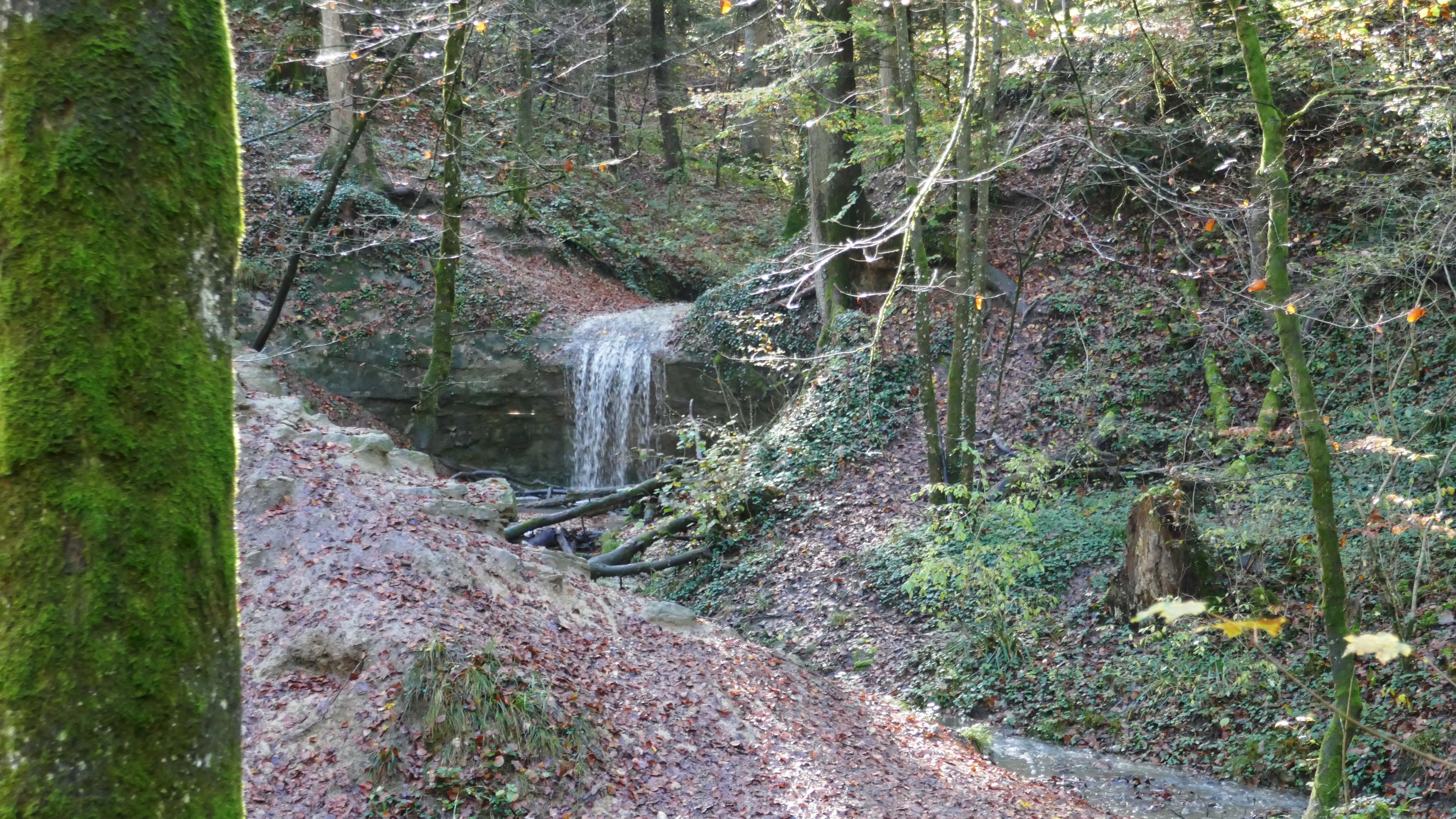 Rundum zufrieden verliessen wir diese gemütliche Wirtschaft. Von nun an gings steil bergab ins Steintobel-Tal. Dort unten führt der Wanderweg entlang des schmalen Baches und vorbei an einem sprudelnden kleinen Wasserall, den wir uns natürlich näher anschauen mussten. Am Ende des idylischen Tobels mündet der Bach in die Töss und schon von weiten sahen wir die ersten Häuser von Sennhof.