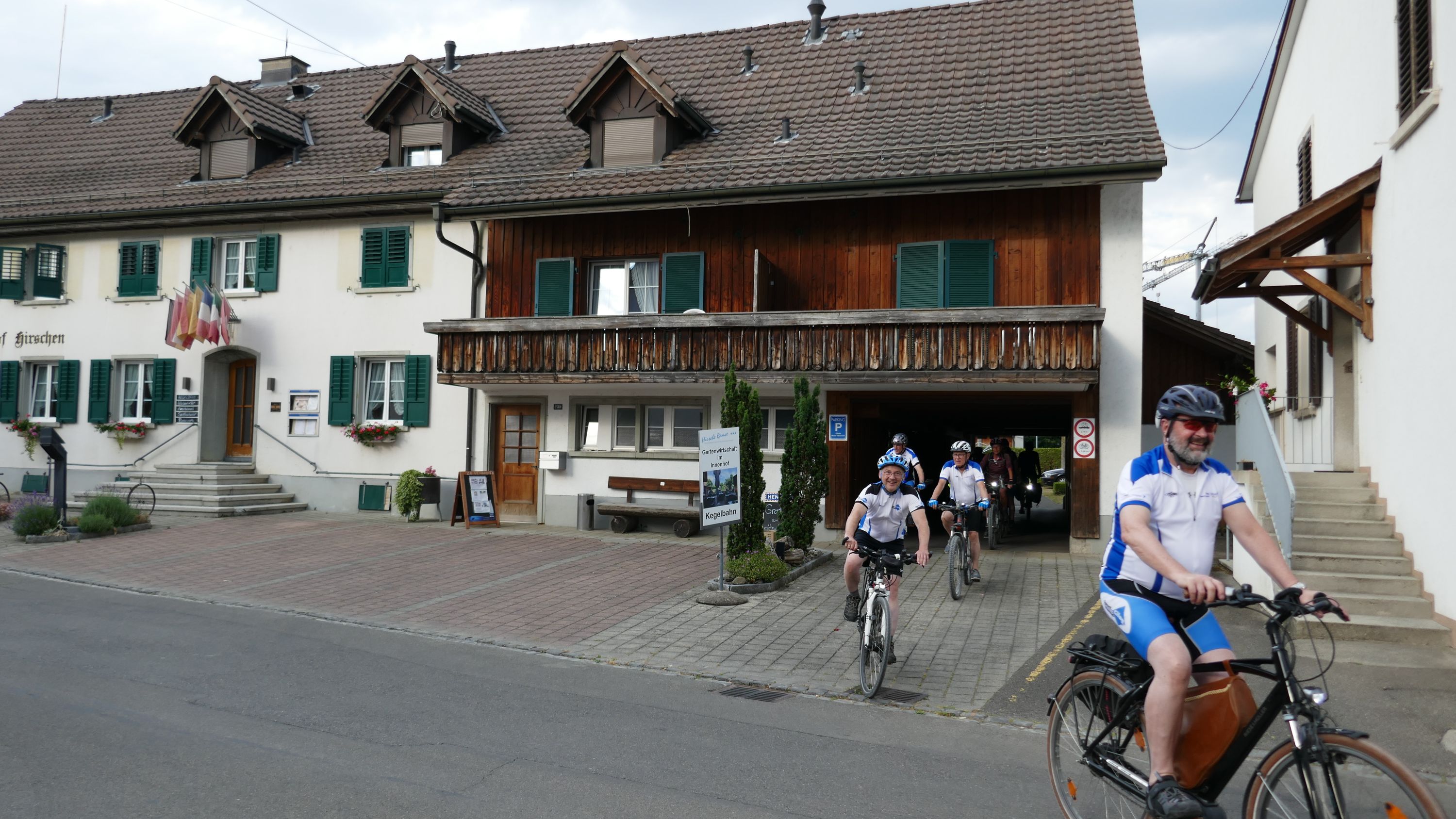 Am Donnerstag den 15. Juni um 16 Uhr trafen sich 11 VelofahrerInnen auf dem Parkplatz beim Portier in der Hochstrasse. Nach dem wir von Rebecca begrüsst wurden und alle Angemeldeten bereit waren, setzte sich die Gruppe, geführt von Urs Schneckenburger, in Bewegung. Über die Hochstrasse fuhren wir ins Herblingertal und vorbei am Kieswerk Solenberg nach Dörflingen. Nach einem kurzen Halt und einem Schluck aus der Trinkflasche ging es weiter. Kurz vor dem Zoll verliessen wir die Teerstrasse und bogen in den Kiessweg ein der uns nach Gailingen führte. Nach den letzten Häusern zweigten wir rechts ab Richtung Staffelwald. Hier schätzten wir den Schatten und verliesssen diesen schönen Waldweg erst vor der Bibermühle. Jetzt gab es nochmals einen Trinkhalt und danach radelten wir direkt nach Ramsen, wo wir im Hotel Landgasthof Hirschen erwartet wurden. Gleich nach der Ankuft begrüsste uns die Wirtin in der schönen schattigen Gartenwirtschaft und zeigte uns das bereitgestellte Buffett. Gerne füllten wir unsere Teller mit den feinen Köstlichkeiten die hier für uns bereit standen. Ausgeruht, gestärkt und guter Laune verliessen wir diese schöne Gastwirtschaft und lenkten unsere Räder, via Buch, auf dem schönen Biber-Radweg nach Bietingen. Hier verabschiedete sich Dandolf von der Gruppe während diese ihre Fahrt nach Schaffhausen fortsetzte, von wo wieder ein Teil der Biker direkt nach Hause fuhr. Ein kleiner Rest entschloss sich für einen Abschlusstrunk in der schönen gemütlichen Gartewirtschaft vom Restaurant Adler.
