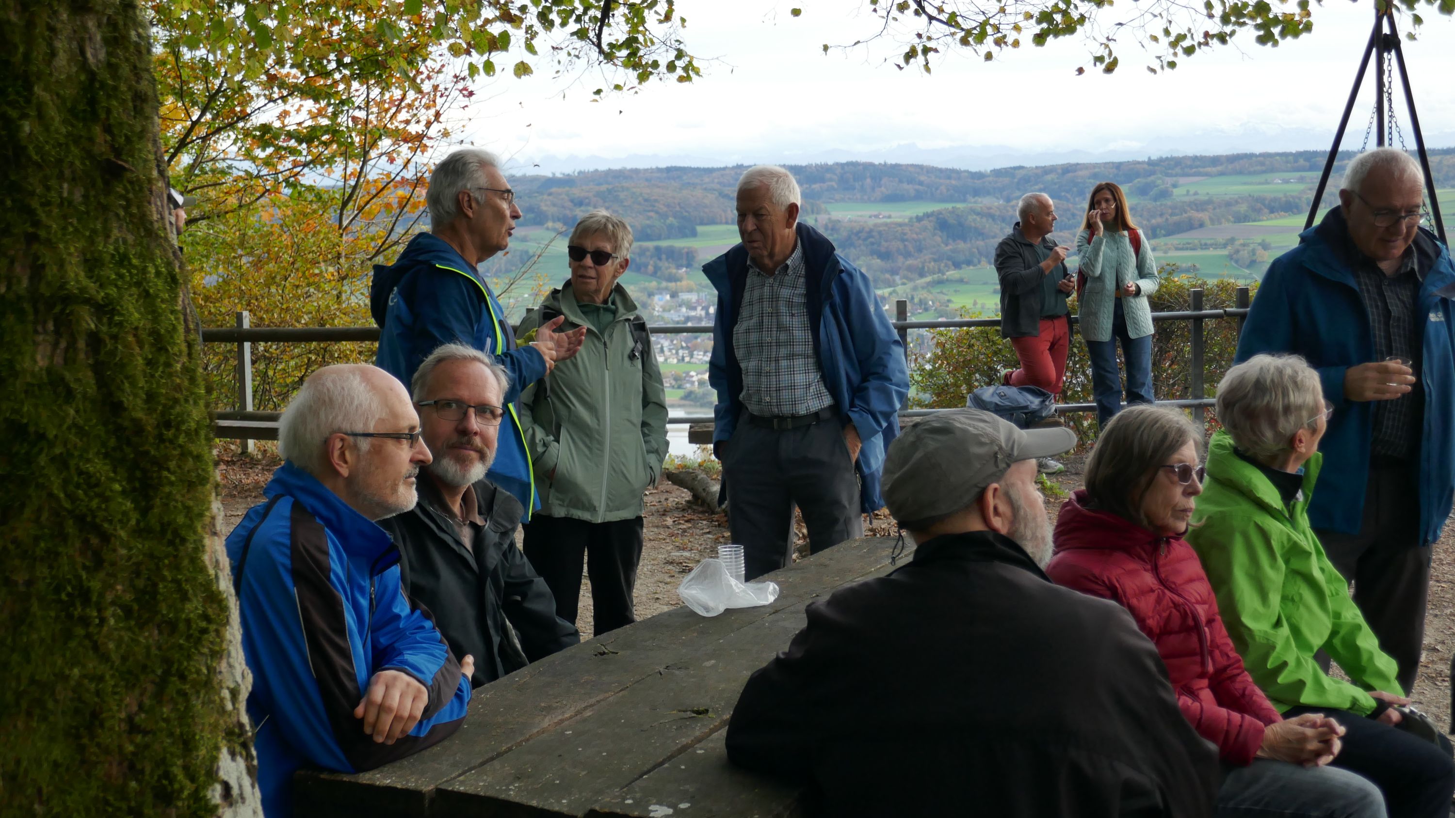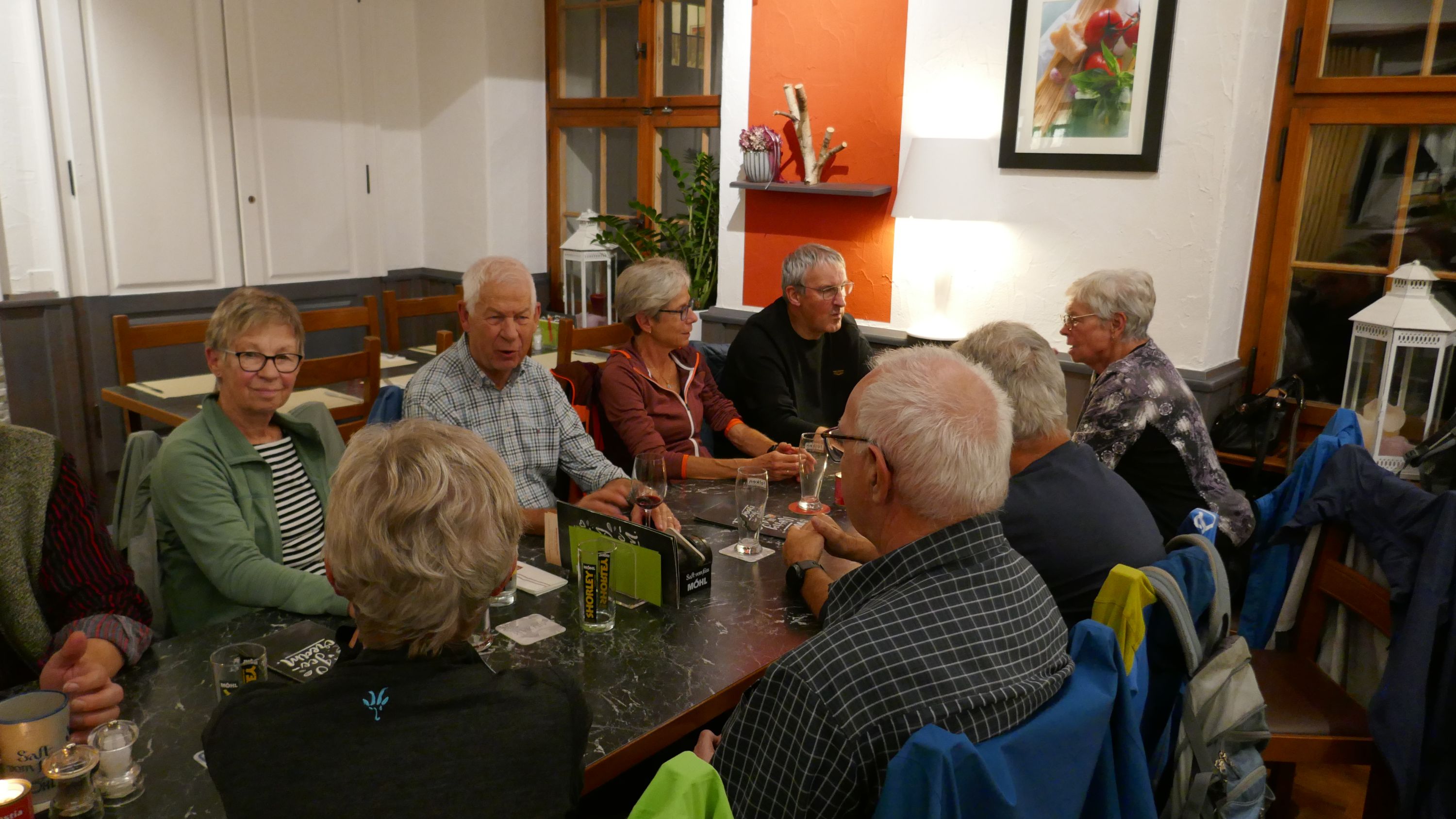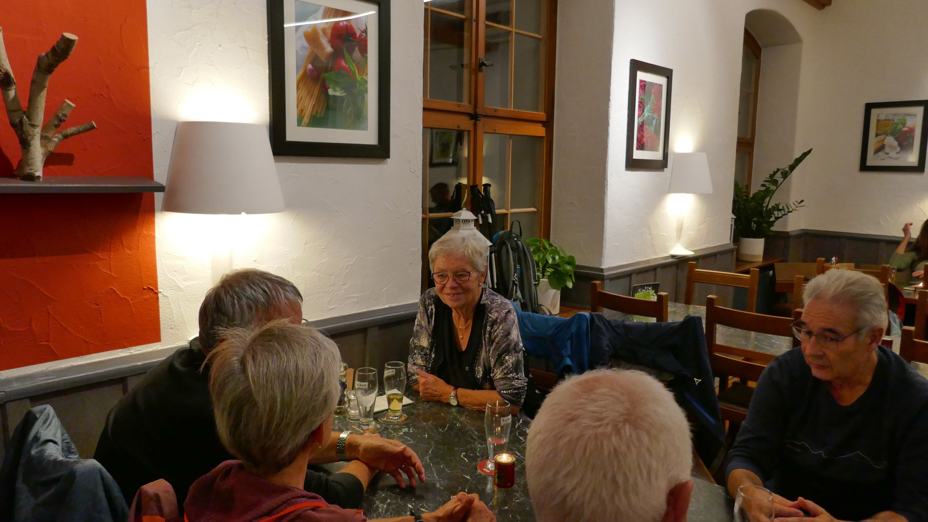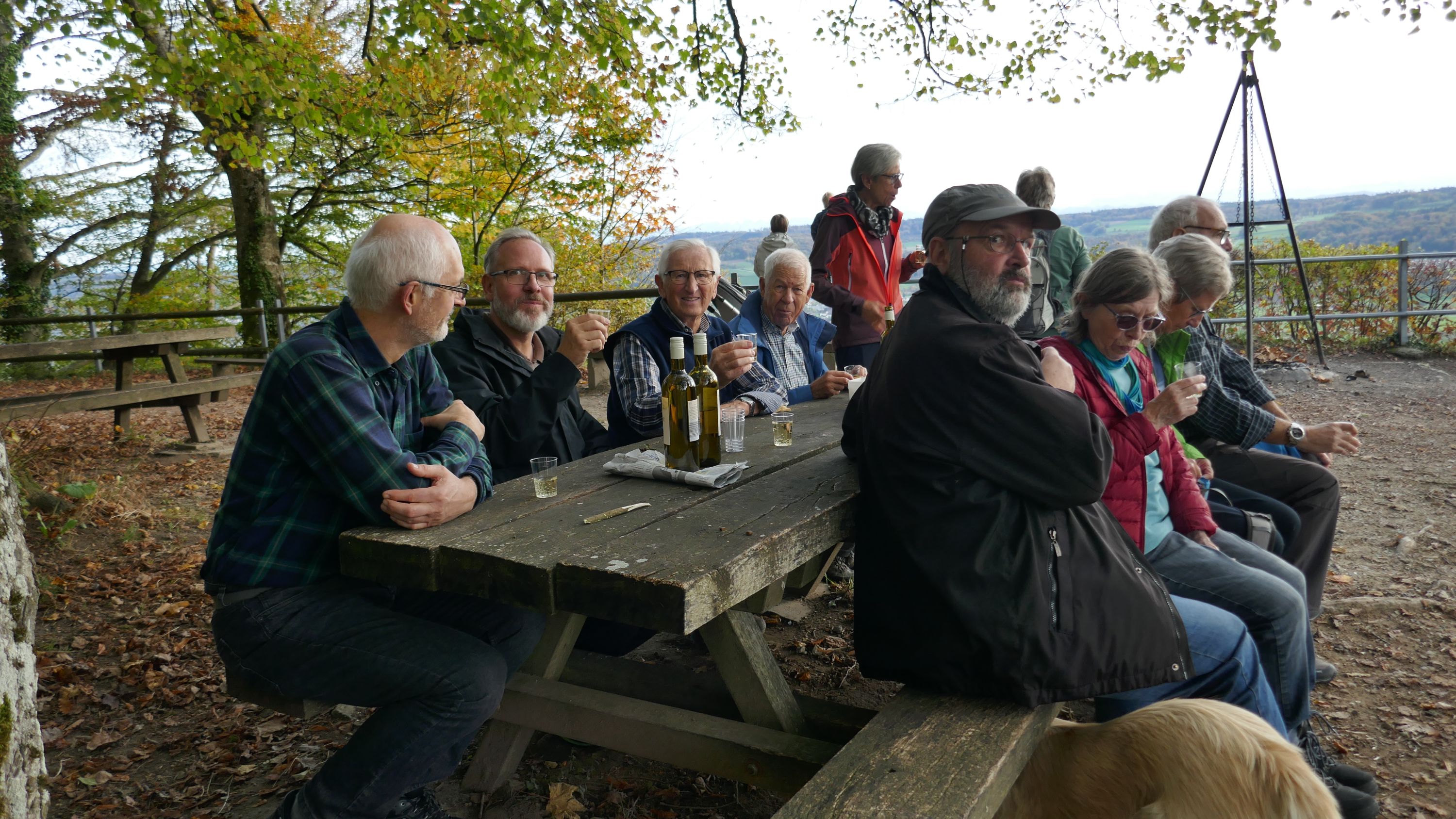 Jetzt war es nur noch eine lockere Wanderung bis zum schönen Aussichtspunkt wo wir wiederum das herrliche Panorama genossen, bevor wir uns einen Platz an einem der Tische suchten. Nebst der Aussicht gab es jetzt eine Belohnung, in Form eines Aperos, die alle gerne annahmen. Gut gelaunt und ausgeruht verstauten wir das Leergut in den Rucksäcken und verliessen diesen schönen Ort. Vorbei an der Burg Hohenklingen ging es hinunter nach Stein am Rhein. Auch beim Abstieg hat man nochmals einen schönen Ausblick über das Städtchen und den Untersee. Vorbei an den herbstlichen Reben erreichten wir bald die ersten Häuser und lenkten unsere Schritte hinunter zum Rhein. Beim Restaurant Wasserfels war diese sportliche Wanderung zu Ende und in der warmen Gaststube wurden wir schon von Heidi und Urs erwartet. Danach mussten wir uns nur noch auf die Speisekarte konzentrieren und etwas feines auswählen.